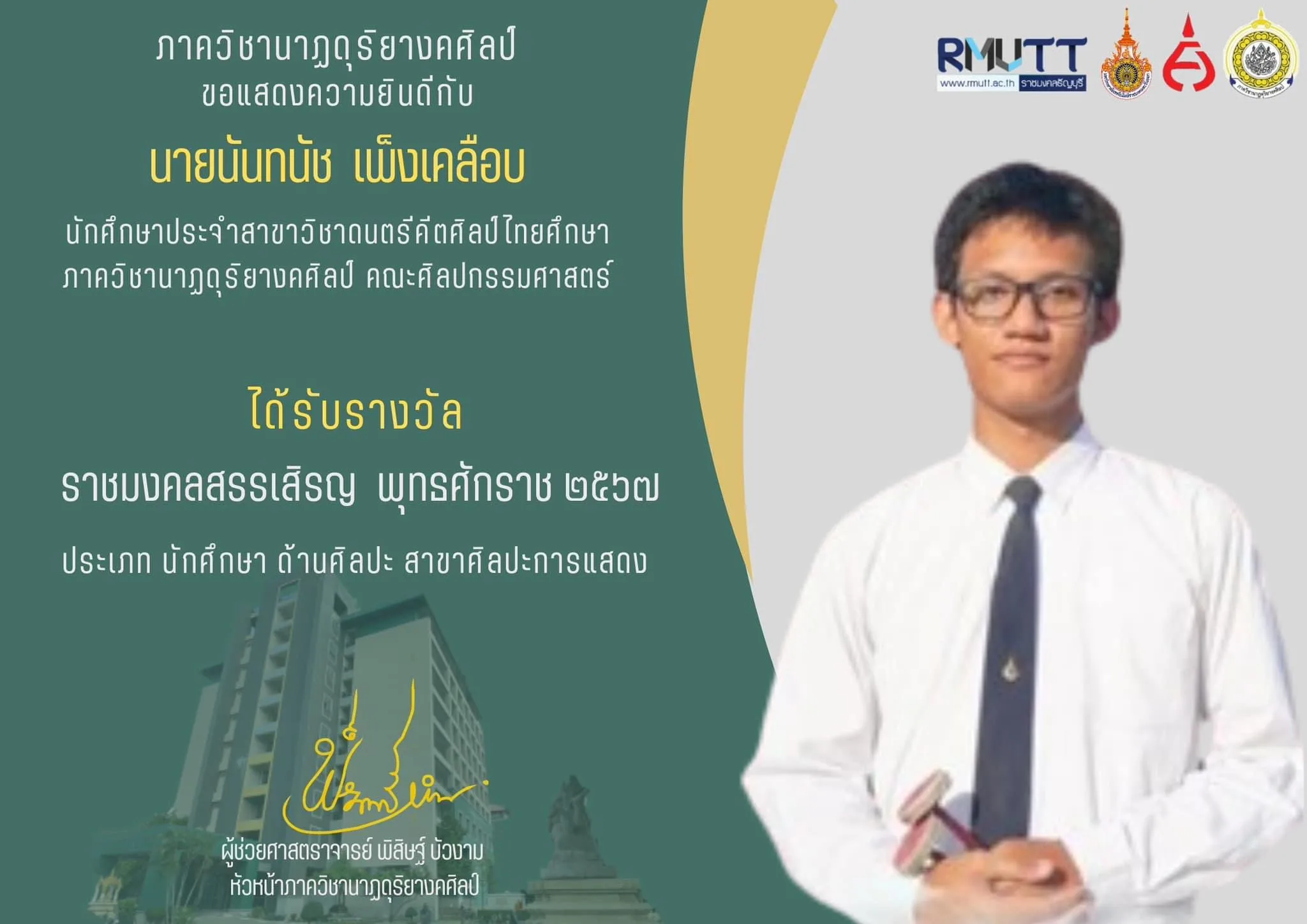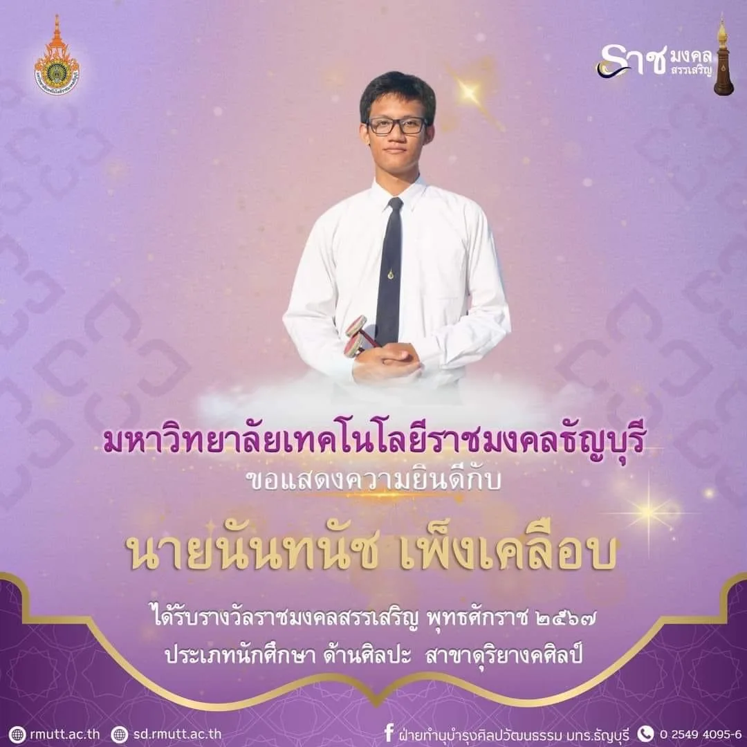นายนันทนัช เพ็งเคลือบ นักศึกษาชั้นปีที่4 หลักสูตรดนตรีคีตศิลป์ไทยศึกษา ได้รับรางวัลราชมงคลสรรเสริญ พุทธศักราช 2567